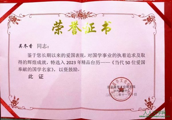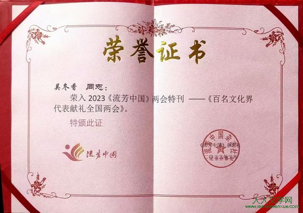 吴冬香,优秀爱国主义诗人,作家。中国诗书画院研究院副院长,暹华文化研究院研究员,中华诗园杂志社副社长,中国散文网特约作家,咸宁市作家协会会员,中国书画春节联欢晚委员会委员,人人文学网主编。毕业于中共中央湖北省委党校干部经济管理专业,作品曾多次在全国各大媒体报道发表。荣获第四届中国传统文化传承贡献奖,2018年全国文艺大赛被授予“全国文艺先进工作者”。2018中外诗歌散文《先锋人物》。2018中国传统文化传承与发展高峰论坛荣获"文化传承贡献奖"。社会荣誉:当选复兴之路、强国有我,当代50位爰国奉献的国学名家;迎接建党100周年大型爱国主义教育丛书《百年丰碑——中华儿女风采录》投稿入编。当选第十二届全国榜样代表大会代表。诗歌《岸英我的岸英——刘思齐写给毛岸英》入选当代文艺家艺术赋能代表。诗歌《我与你美国》荣获爱国主义诗人光荣称誉。《冬忆》荣获最美爱情诗歌奖。《爱》荣获最隹新诗奖《悠悠的梁家河》《梦回延安》《我爱中国红我爱中国共产党》荣入中国作家报红诗专栏。歌曲《你就是我生的希望》为抗击疫情而作,《你们是共产党的先锋》入选迎接建党百年红歌传唱!