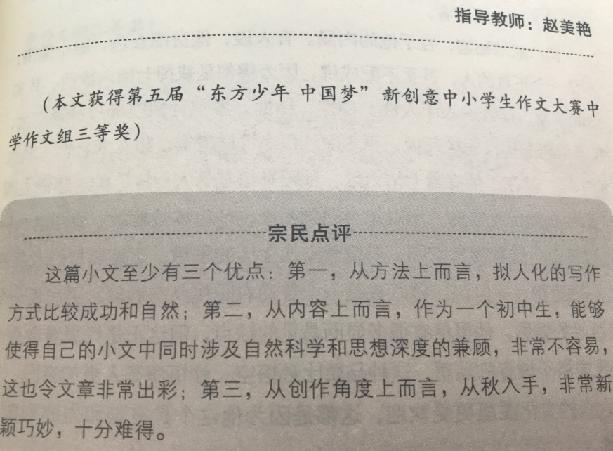 【文章点评:这篇小文至少有三个优点:第一从方法上而言,拟人化的写作方式比较成功和自然;第二,从内容上而言,作为一个初中生,能够使得自己的小文中同时涉足自然科学和思想深度的兼顾,非常不容易,这也令文章非常出彩;第三,从创作角度上而言,从秋入手,非常新颖巧妙,十分难得。】