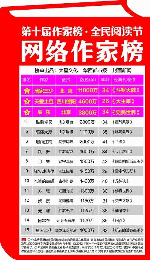 今(25)日,大星文化、华西都市报、封面新闻重磅发布备受关注的网络作家榜!过去一年是网络文学的爆发年,根据网络文学作品改编的电影、电视剧、网络剧霸占了去年大小荧屏。这些IP(知识产权)改编影视作品的爆红,也给网络作家带来了更多的版权收入。唐家三少成为作家榜发榜十届以来,首位年度收入过亿的作家,成为“作家榜亿元俱乐部”首位作家。