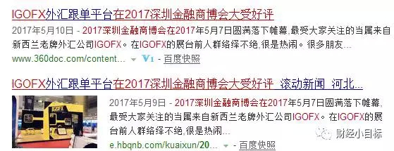 根据网络资料显示,深圳是IGOFX在中国的诈骗起源地,现在在网络上搜索,还能找到IGOFX在2017深圳金融商博会大受好评的信息。