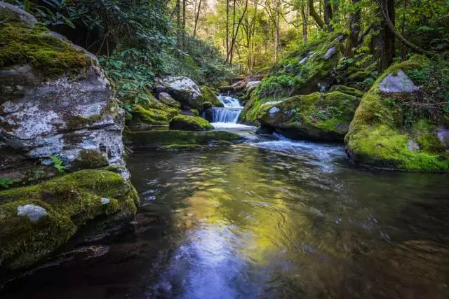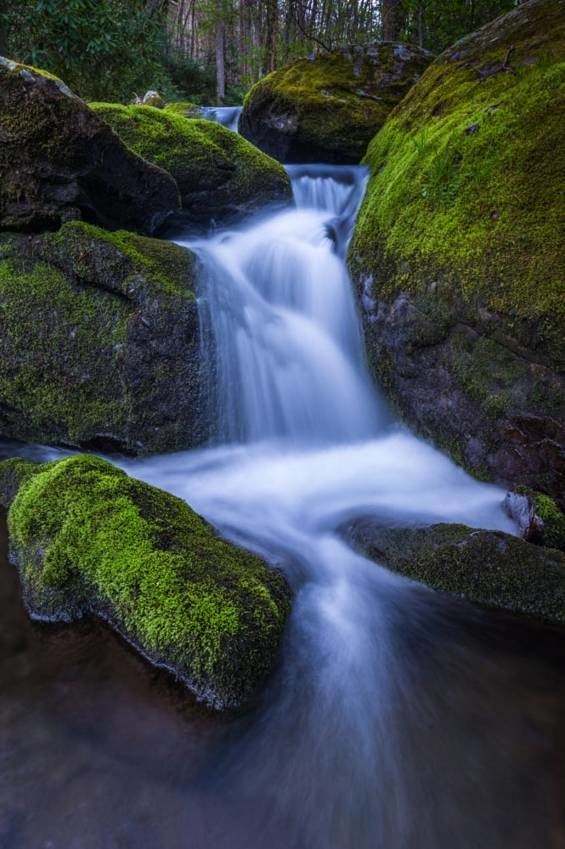 因为溪流处大多数都会有树木的覆盖,光线相对较弱,选择凌晨或者午后,光线较弱时,不用借助减光镜也是可以拍摄的。