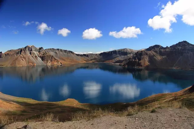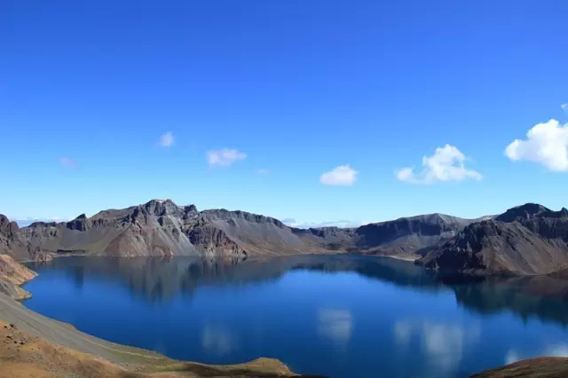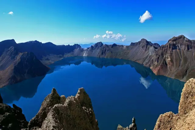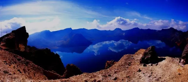 长白山天池 天池的一池碧水宛如从天外飞来的一面大镜,镶嵌在云飞雾腾地万山之顶。池水晶晶莹莹,晨昏晴雨,变幻无穷。