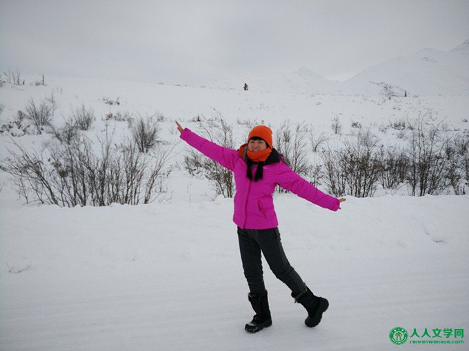 ( 自驾万里征北极第11天) 刘雅阁 ![]() 又经过大风口,狂风卷起雪尘和冰屑,飞扬起浓浓的雪雾,风与雪紧紧裹携着我们的车,如同落入了《西游记》里黑风怪的魔爪,反抗不得。只好紧紧握住方向盘,一分一秒地挨过大风口。 一段大上坡,一览众山小,身边就是翻卷涌动的云、雾、雪。好像在天庭腾云驾雾一般。 每次下大坡、大角度急拐弯时,手心里都紧紧捏一把汗,连副驾驶都全神贯注的盯着看路,不敢言语。可我们的一号车——王更的车,其车速仍然120迈或100迈,好惊险,好刺激啊! 去程不容易,归程更要注意安全! ![]() 白茫茫的雪世界,唯独头顶是淡蓝绿色、极纯净的天空。在北极,只有天空的颜色可以帮助眼睛分清天与地。渐渐的,太阳西下,燃烧了天边的云,在雪域的地平线上的闪耀着金光。 天地有大美而不言。 停车,伸出双臂举向天空,托起雪中的夕阳和漫天的晚霞。 再次上路,对讲机传来了王更的声音,说,他们发现了一只横穿公路的火红狐狸,问我们看到没有。我们赶紧向车外看,但狐狸窜得太快,我们什么也没有看到。 继续赶路,一会儿又传来三号车巧芸的声音,说,刚才他们车的后备箱好像忘了关,已经开出来十几公里路了,应该掉了行李了。