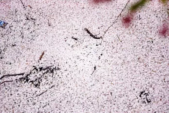 从高空俯瞰,盛开的早樱花犹如镶嵌在绿毯上的绣花,抱团打簇,好不热闹!