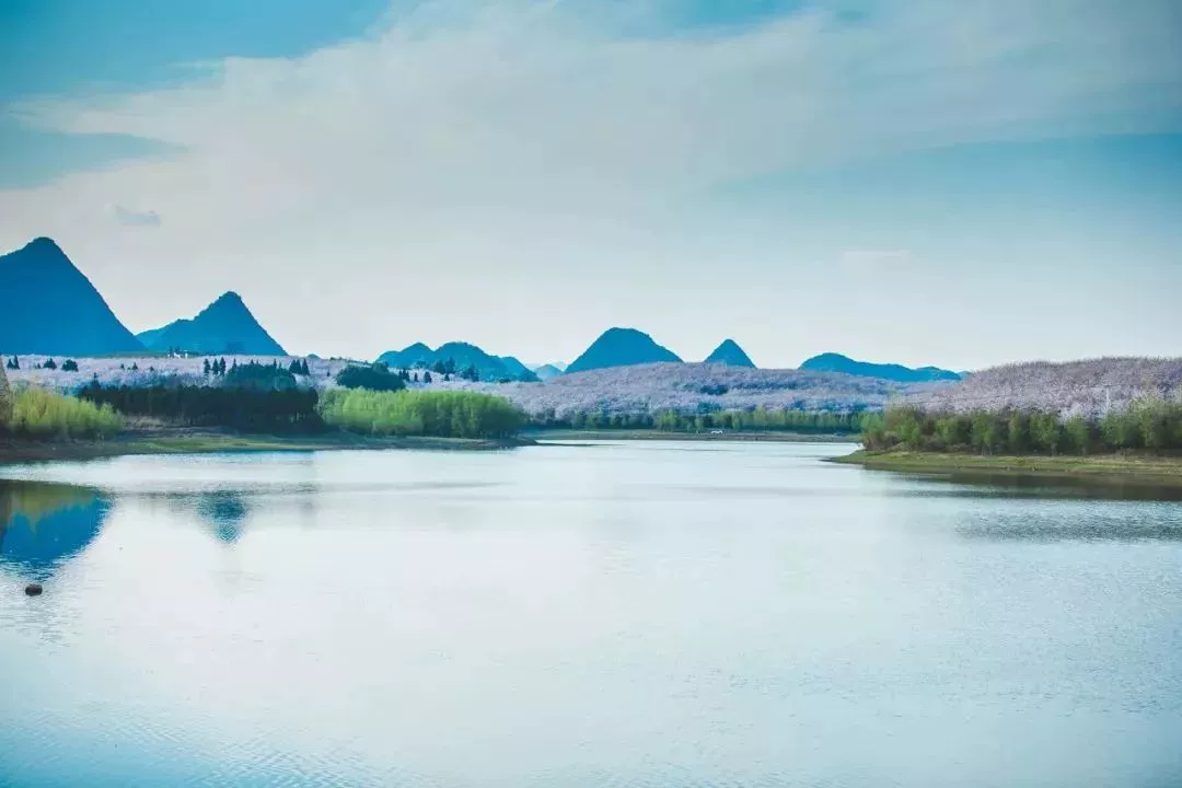 盛花期,上万亩樱花紧连着红枫湖畔蔓延,将大地点缀成一片浪漫粉色,只见满眼黛色的山、碧蓝色的湖面、翠绿的草树和朦胧的粉红的花。