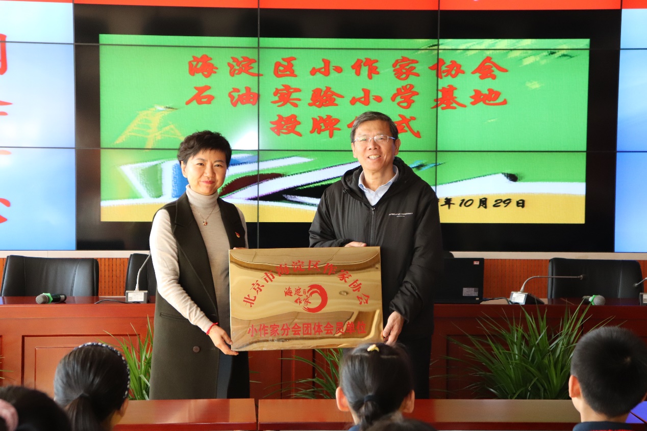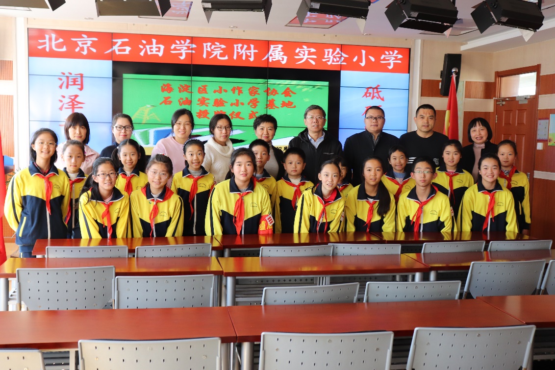 北京石油学院附属实验小学则由海淀区作家协会秘书长王威、北京石油学院附属实验小学校长王梅、小作协负责人王彬、北京石油学院附属实验小学教研主任宋春艳等老师和部分学生代表出席本次授牌仪式。