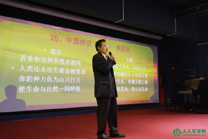 晚会现场 学院派诗人熊国华先生朗诵了他的组诗《中国神话》,组诗包括《盘古》《女娲》《夸父》《精卫》等,这位中国诗歌学会理事、国际诗人笔会秘书长、国际华文微诗 群(微信)群主的教授诗人,激情澎拜,酣畅淋漓,当他朗诵到这样的诗句“你是想看清楚新娘的模样吗?我知道这是怎样的一种渴望。喝干了黄河渭水,还止不住,宁愿渴死,也要追赶太阳(《夸父》)”,观众席上掌声雷动。