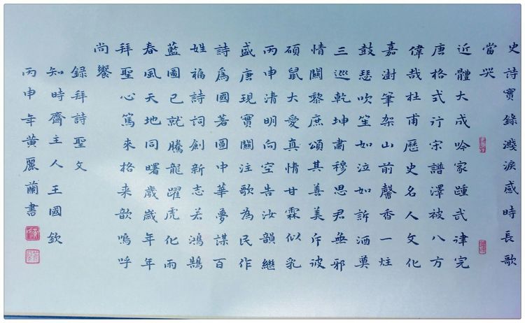 《拜诗圣文》书法长卷,由著名诗词策划人东之策划监制,由著名诗人蔡世平、林从龙、刘征先后赐墨题跋,由全国诗词楹联书画界数十位著名人士联署签名。书法由黄丽兰女士精心创作,原文由王国钦先生历经三年泣血撰写。