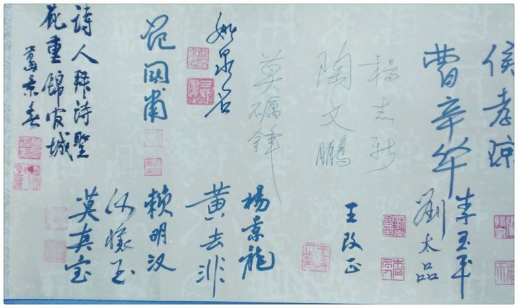 《拜诗圣文》书法长卷在整整长达一年的创作、题署过程中,先后得到了蔡世平、王改正、王国钦、张脉峰、王博生等人的大力帮助;先后得到了中国国学中心……等单位的积极支持;先后得到了王兆鹏、施议对、梁东……等数十人踊跃签署。在此,长卷策划人东之、原文作者王国钦一并表示诚挚的感谢!