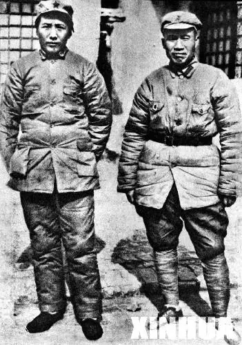 毛泽东和朱德在中共七大(1945年4月23日)会议期间合影。从1936年开始国共合作抗日,共产党及共产党领导的军队都是国民政府的一部分,受国民党领导。朱德是国民革命军第八路军(八路军)的司令,照片中的朱德头上戴的是国民党军帽。后来在很长一段历史时期中,这张照片上朱德的军帽被修去了国民党徽章,有些人认为国共合作在当时的历史条件下虽然是一个重要的选择,但是毕竟最终没有成功,历史本身是客观无声的,只不过展示给后世但无声这段并不湮没无闻也最好。