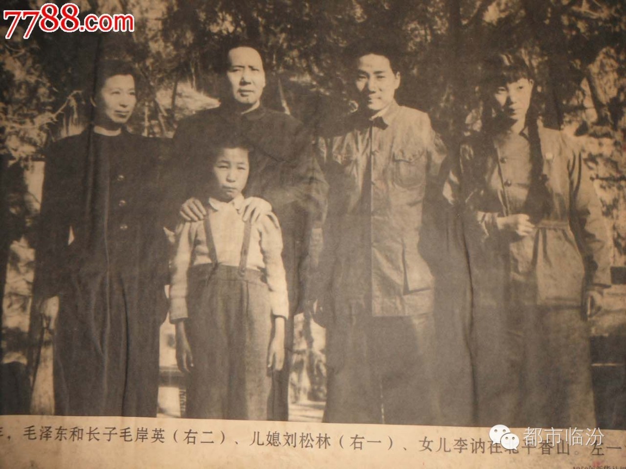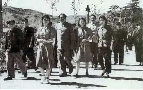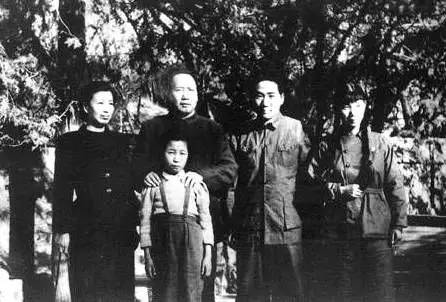 1949年,毛泽东与江青(左1)和长子毛岸英(右2)、儿媳刘松林(右1)、女儿李讷在北平香山。