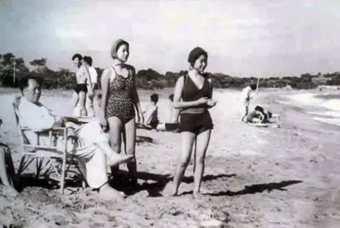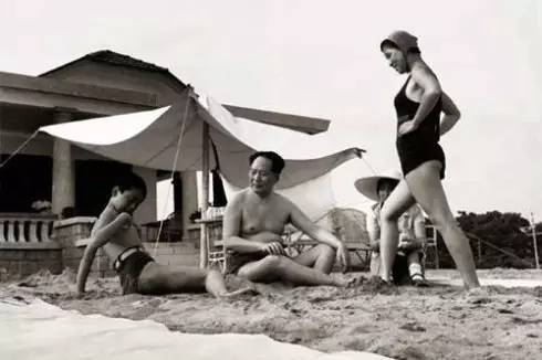 1955年,毛泽东和两个女儿、侄子,在北戴河浴场。