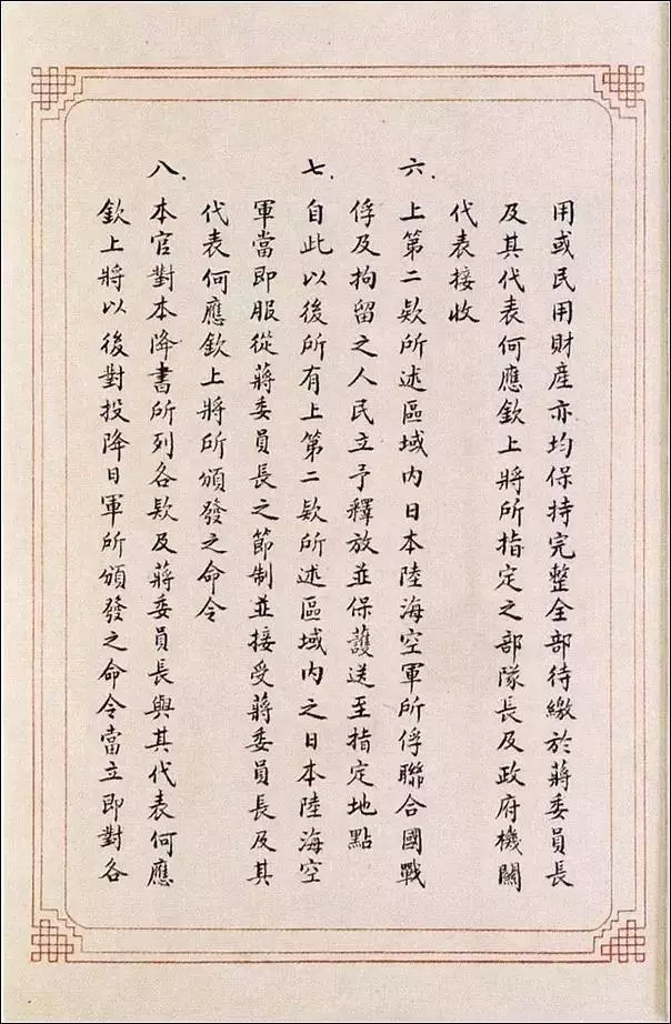 七、自此以后,所有上第二款所述区域内之日本陆、海、空军当即服从蒋委员长之节制,并接受蒋委员长及其代表何应钦上将所颁发之命令。