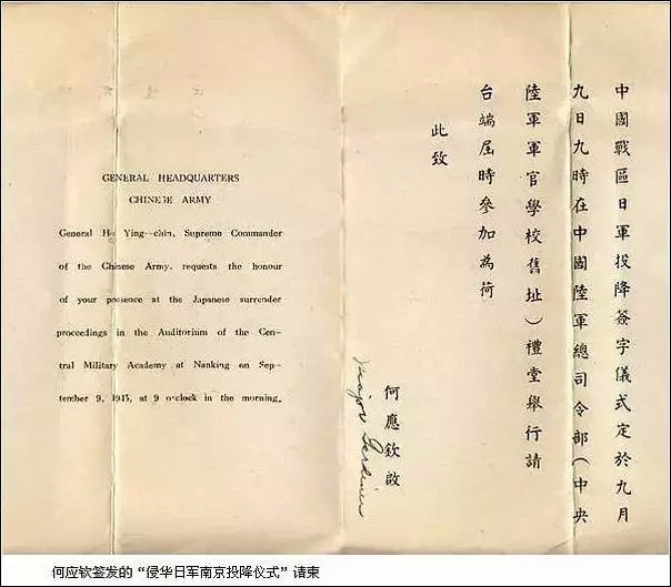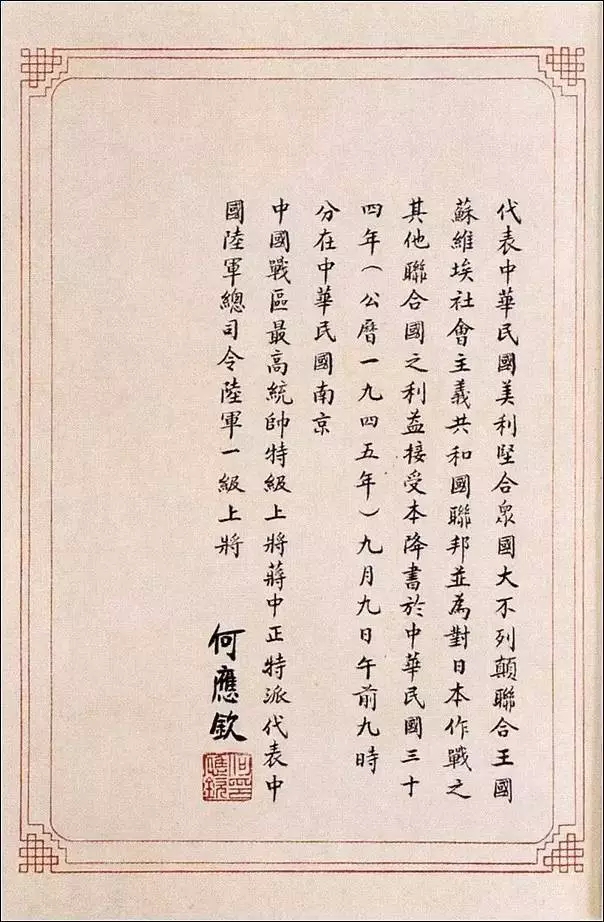 中国战区最高统帅特级上将蒋中正特派代表中国陆军总司令陆军一级上将何应钦印