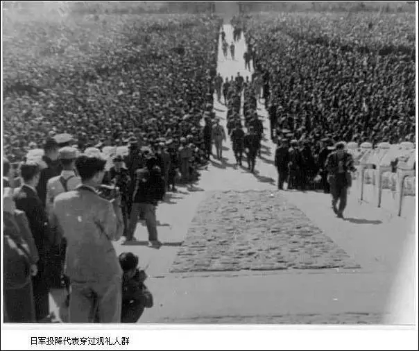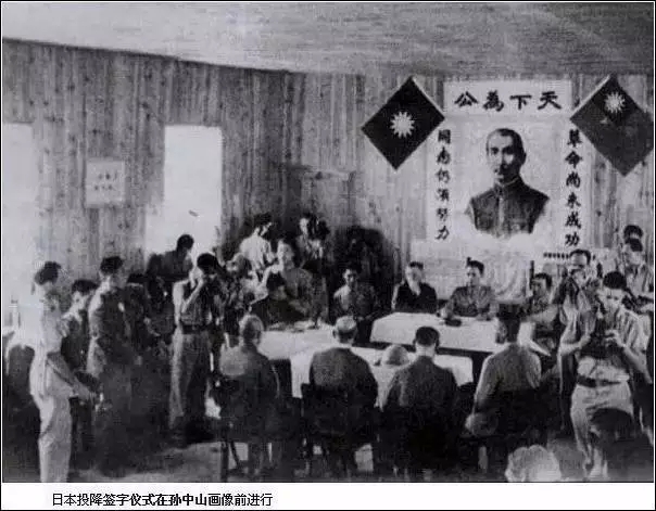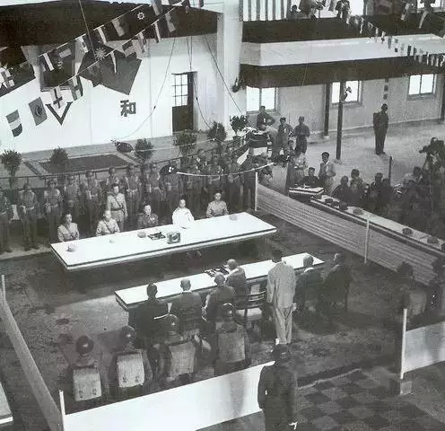 ▲1945年9月9日,民国政府在南京中央陆军军官学校大礼堂接受在华二百万日军正式投降