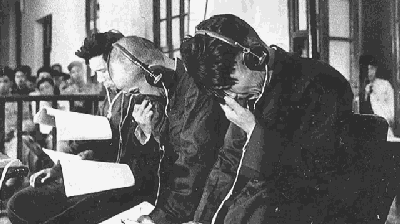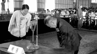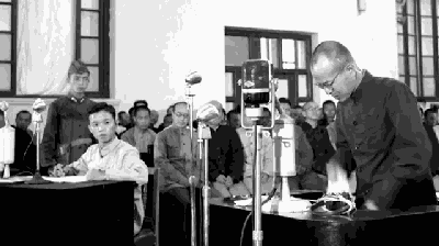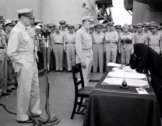 1945年9月9日,侵华日军最高指挥官冈村宁次(右)在南京向中国陆军总司令何应钦递交投降书。