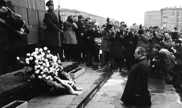 在华沙犹太人死难者纪念碑前双膝下跪。