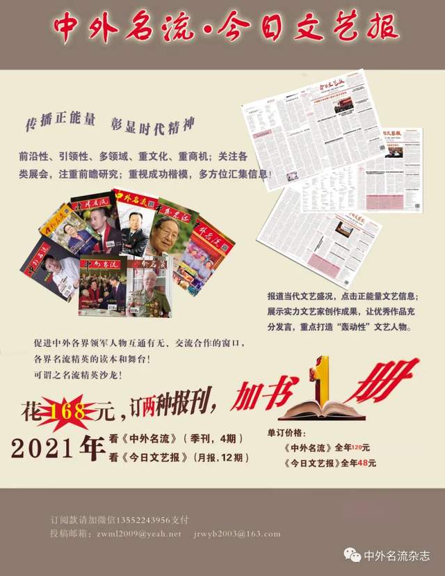 ———————————————————— 主 办:中外名流杂志社 本期刊名题字:倪林 社长兼总编辑:黄长江 主 编:万 玫 编 委: 黄进琪 孙保权 黄长江 王永蕙 王小艾 纪学军 万 玫 杨黎明 蔡唯敏 冯卫东 尹 超 常胜军 张建国 钱琳萍 周 步 艺术呈现:北京儒博文化艺术院 |