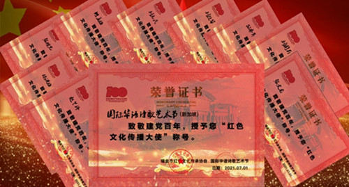 国际华语诗歌艺术节是华侨华人在新加坡注册,宣传华族文化和文明的非盈利机构。总主席是世界著名规划大师、新加坡规划之父、曾担任北京奥运委员会顾问委员会主席的刘太格博士。很荣幸,我作为国际华语诗歌艺术节总策划、品牌运营总监和媒体人,积极策划、组织,承担并推动了本次展播活动,主办方通过对志愿者和宣传媒体的集中测评,有73位志愿者和27个媒体宣传平台,获得致敬建党百年红色文化传播大使荣誉称号,为活动交出了圆满的答卷。