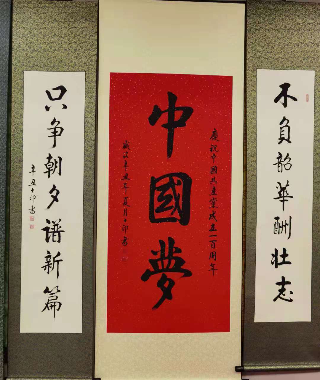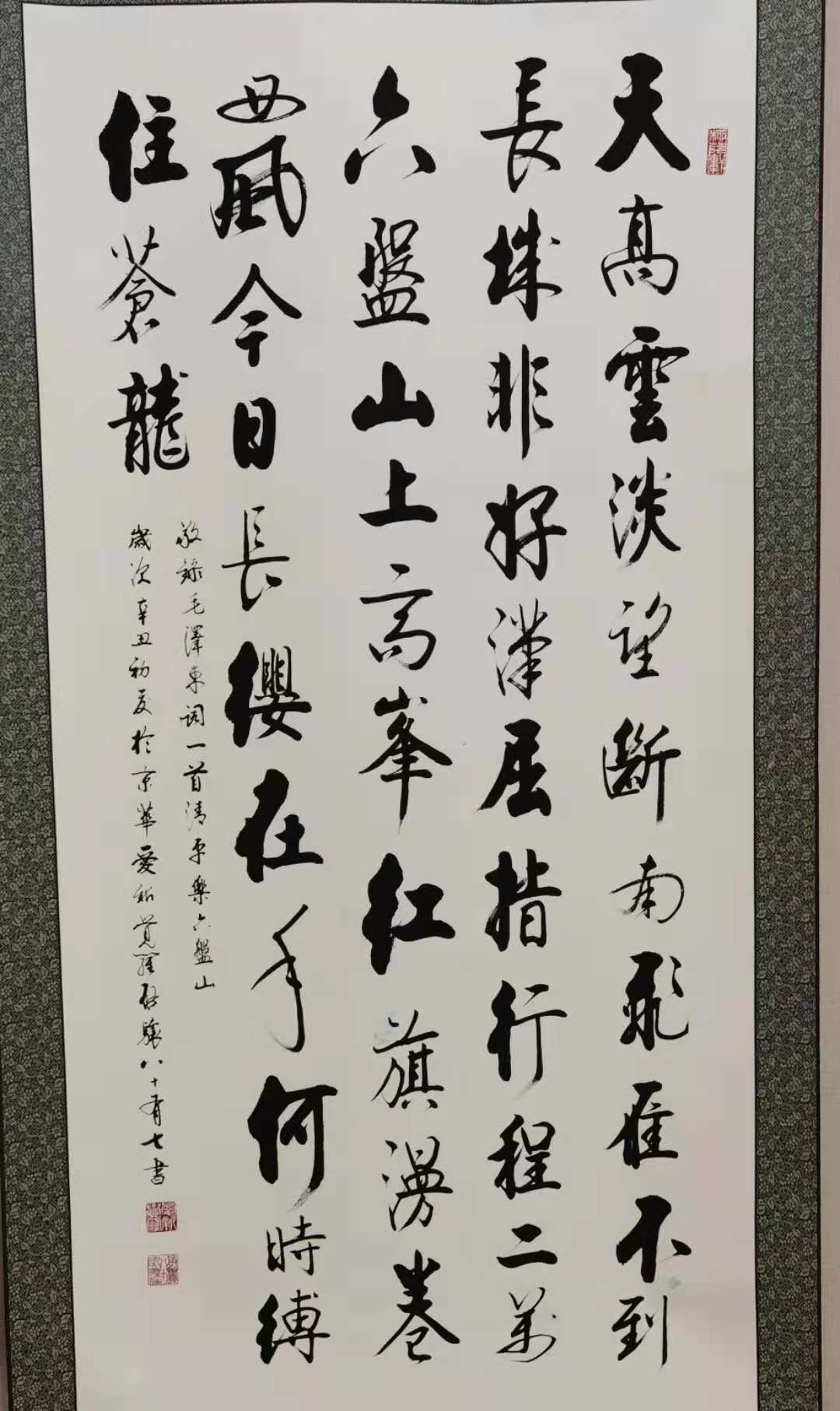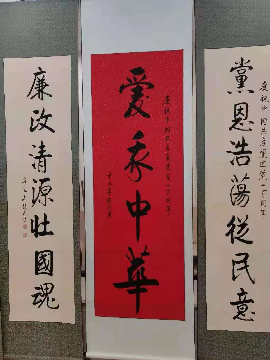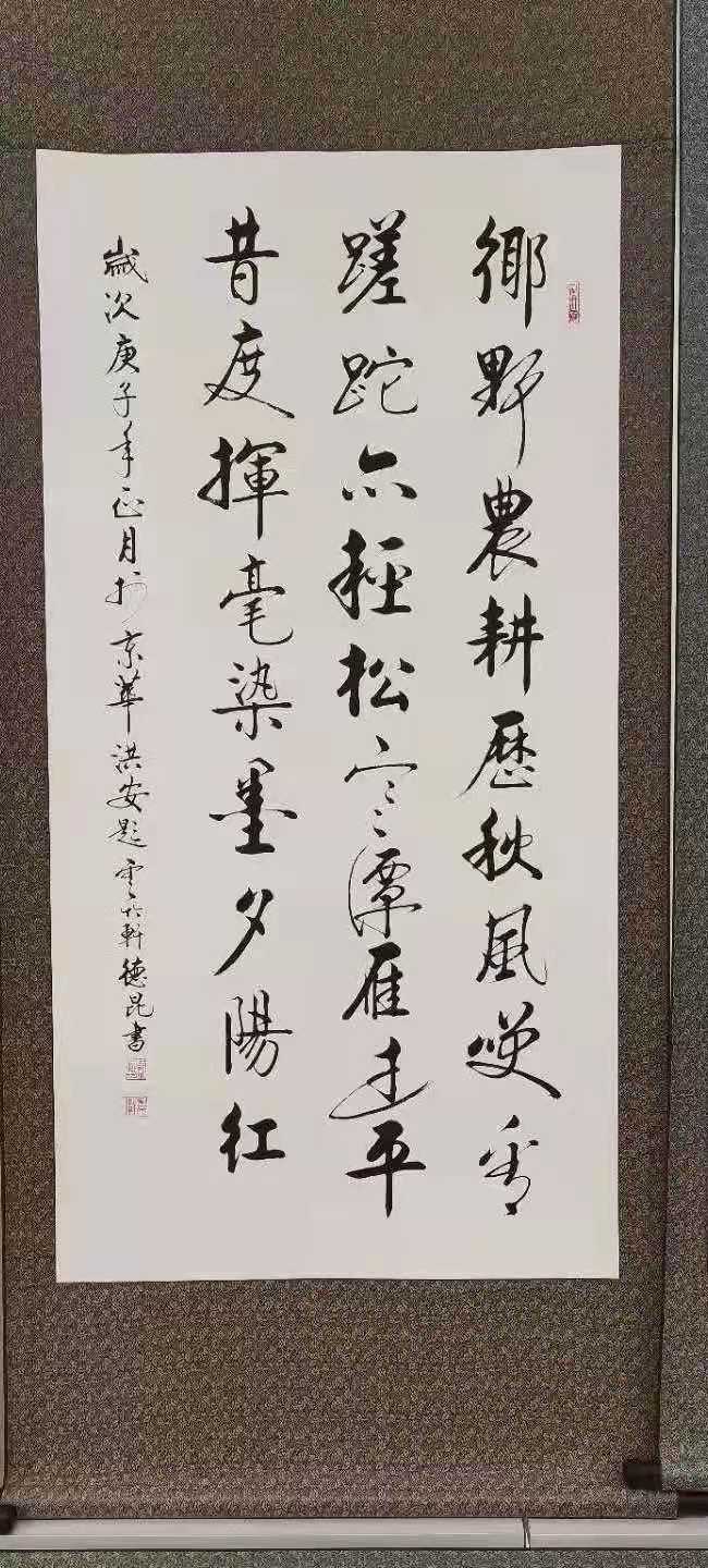 2019年末,启骧先生在北京民族文化宫举办“爱新觉罗启骧师徒书法展”以弘扬传承中国书法真善美艺术。在启骧先生爱徒展厅,马德昆的“岳阳楼记”四幅条幅十分引人注目。马德昆热爱书法艺术,传承中国文化,他还和几个爱好书法的朋友创办了自己的书社,相互学习共同进步。许多书法爱好者亦慕名而来,马德昆总是不厌其烦地指点新人,勉励大家共同进步。也曾和书社的书友们多次去学校为学生举办书法展,以增进师生对中国传统书法艺术的热爱与兴趣。逢年过节,书法社还为社区群众献爱心,开展赠送字幅的公益活动。 书者,艺也,志也。书法也如同文学创作,在书写中释放情怀,把自己的情感融入翰墨笔下,在意境中净化心灵。或许正是马德昆坚守了这艺无止境的追求,才使他从未停下求进觅新的脚步,致使有那么多书法作品一次次走进报刊,走进展厅,走进了人们的视野。