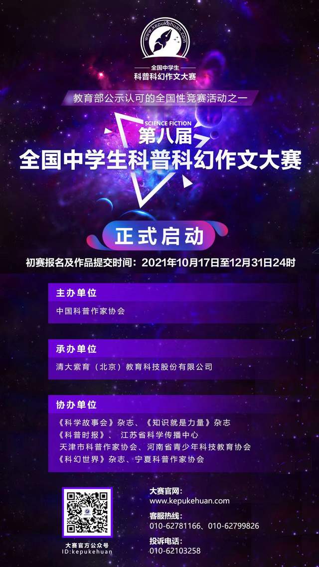 第八届全国中学生科普科幻作文大赛启动 “全国中学生科普科幻作文大赛”是由中国科普作家协会主办的青少年科普科幻教育与创作活动,现已成功举办七届。为继续响应国家繁荣科普科幻创作的号召,为广大中学生搭建科普科幻创作平台,遵照教育部《关于公布2021-2022年度面向中小学生的全国性竞赛活动的通知》,现正式启动第八届大赛及相关活动。现将有关参赛事项通知如下: 一.大赛宗旨 激发广大中学生对科学和文学创作的兴趣、引导中学生追求和探索科学的奥秘、培养科技创新精神和创新能力,搭建展现新时代高中生的科学素养、想象力、创造力与写作能力的平台,实现文学与科学的融合,繁荣科普科幻创作事业。 二.主办单位 中国科普作家协会 三.承办单位 清大紫育(北京)教育科技股份有限公司 四.协办单位 《科学故事会》杂志、《知识就是力量》杂志、《科普时报》、江苏省科学传播中心、天津市科普作家协会、河南省青少年科技教育协会、《科幻世界》杂志、宁夏科普作家协会 五.专家评审委员会 专家评审委员会负责大赛作品评审工作,由学科(行业)内的权威知名专家学者和科普领域内高水平的科普作家、科幻作家、理论家、评论家、编辑家、翻译家、教师代表和组织工作者担任。 六.参赛对象 全国高中生 七.比赛形式 1.科普科幻作文大赛共设置科普、科幻两个创作方向。 2.大赛分初赛、决赛两个环节。其中,初赛通过网络线上提交作品,决赛为现场写作。 3.如遇不可抗力因素(疫情及自然灾害等),比赛的赛制、形式及时间安排以官方通知为准。 八.奖项设置 1.学生 初赛设立省级一、二、三等奖; 决赛设立全国一、二、三等奖。 2.教师 对获奖学生的辅导教师颁发“优秀辅导老师”荣誉证书; 对积极组织参赛的教师颁发“最佳组织者”荣誉证书; 对被遴选参与评审的学校教师颁发“评审委员”证书。 3.学校 对取得优秀成绩的学校颁发“优秀生源基地”奖牌。 九.参赛流程 (一)初赛安排 1. 时间安排(具体时间见大赛官网和官微通知) 报名及作品提交:2021年10月17日至12月31日24时 参赛作品初评推荐:2022年1月1日至1月23日24时 2.报名方式 大赛分团体报名及个人报名两种形式。参赛学生须按要求报名,同一身份证号码只能报名一次,且报名信息一经确认不予更改,请认真填写。 本届大赛支持官网(www.kepukehuan.com)和官微(微信公众号:kepukehuan)报名。 (1)团体报名 第一步:登录大赛官网(www.kepukehuan.com)注册团体参赛账号,下载团体参赛申请书模板并按要求填写,参赛学校加盖公章拍照上传至报名系统,组委会审核。 第二步:组委会审核通过后,下载团体报名表模板,并按报名表要求填写参赛学生信息,填写完毕后将报名表上传至报名系统即完成报名。 温馨提示:完成报名后,系统生成学生参赛账号,学生账号为报名所用手机号,密码默认为手机号后六位。 (2)个人报名 登录大赛官网(www.kepukehuan.com)或官微(微信公众号:kepukehuan)注册个人参赛账号,完善个人报名信息。下载个人参赛申请书模板并按要求填写,所在学校加盖公章拍照上传至报名系统,组委会审核通过后即完成报名。 3.作品提交 初赛报名成功后即可查看初赛参赛题目,请仔细阅读参赛作品写作要求,按时提交作品(本届支持官网和官微两种方式提交作品,团体报名参赛学生,需登录个人账号验证手机号后方可提交参赛作品)。 4.作品初评推荐 学校或其他授权组织可组织骨干教师、当地科普科幻作家等进行初评推荐,由团体参赛负责人登录大赛网站(www.kepukehuan.com)分配评审任务,对参赛学生作品进行初评推荐。团体参赛负责人审核并提交审核意见至专家评审委员会,由专家评审委员会统一初评推荐。 5.作品复审评审 大赛评审专家委员会对初评推荐稿件进行复审,评出省级一二三等奖,参赛学生获奖结果将在规定时间内在官网和官微公布。 (二)决赛安排 1. 时间安排 参赛报名时间:等待组委会官方通知 2.参赛资格 在初赛中获得省级一等奖的学生可报名参加决赛。 3.决赛考试 决赛为现场赛(根据疫情情况调整,详见大赛官网和官微通知),具体时间安排组委会通过线上注册手机号短信通知参赛学生,同时请关注大赛官方平台通知。 4.作品评审 大赛组委会组织评审专家委员会对决赛作品统一评审,选评出全国一二三等奖。 十.补充说明 1.大赛本着公益性、自愿参赛的原则,不收取任何费用。大赛专家评审委员会会公平、公正地评选出每一篇获奖作品。(决赛期间参赛学生的交通、食宿等费用自理,并自行购买意外保险,安全事宜责任自负。) 2.本届大赛将在全国中学生科普科幻作文大赛官方网站及官方微信公众号实时公布大赛进程,所有获奖参赛学生的获奖情况均可在大赛官网进行查询。参赛作品一经获奖即视为作者同意大赛组委会有编辑发表、出版使用权。 3.本届大赛参赛学生、辅导教师、组织教师等获得的证书均在大赛官网自行下载电子版证书,组委会不再颁发纸质证书。 4.初赛阶段团体参赛300人以上或参加总决赛人数20人及以上的团体学校,授予“全国中学生科普科幻作文大赛优秀生源基地”。 5.如参赛学生在报名参赛期间出现作弊等违规行为,组委会有权取消其考试资格,并在大赛官网通报批评。 6.本赛事通过了教育部办公厅公示的“2021-2022年度面向中小学生的全国性竞赛活动名单”。