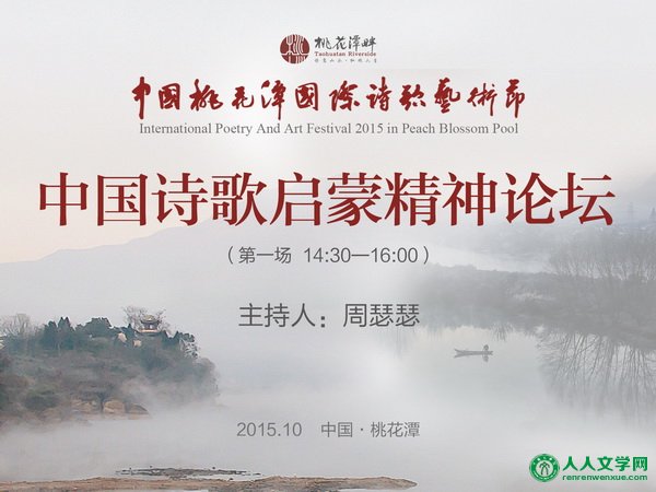 人人文学网讯:2015年10月16日至18日,2015中国桃花潭国际诗歌艺术节暨中国诗歌启蒙精神论坛在安徽宣城桃花潭举行。本次活动由《诗刊》社、鲁迅文学院、国际汉语诗歌协会、北京师范大学中国当代新诗研究中心、宣城市人民政府主办,是近年较高规格、较大规模的一次诗歌、学术与艺术相融合的具有海内外影响力的活动。