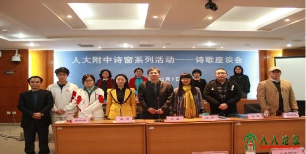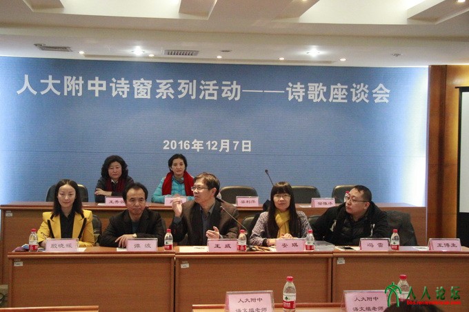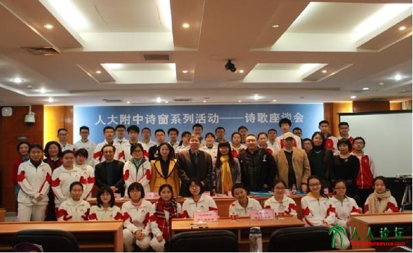 首届中学生诗歌论坛人大附中站成功举行 人人文学网讯:2016年12月7日,由海淀区作协、人大附中校团委主办,人大附中槐雪诗社、木瓜读书会协办的第一届中学生诗歌论坛人大附中站,在人大附中高中楼成功举办。活动的目是普及诗歌知识,开拓眼界,为中学生诗歌