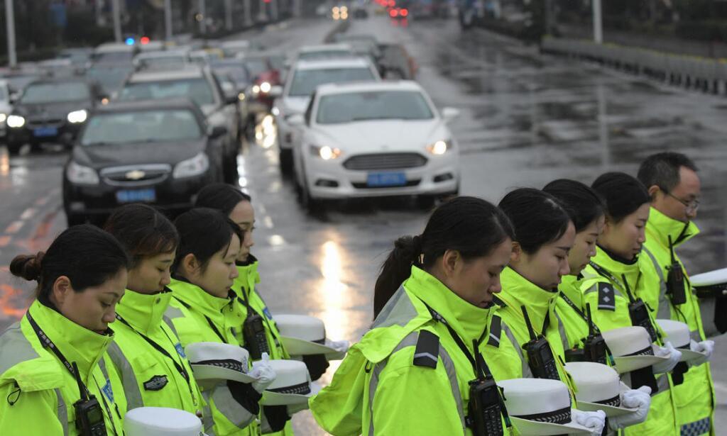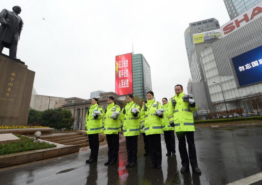 南京上空警报再响,机动车停驶并鸣笛致哀。正在新街口执勤的交通民警脱帽向南京大屠杀死难同胞默哀。