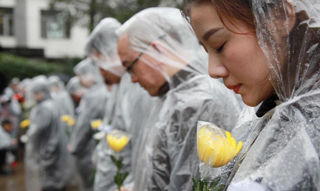 各界人士冒雨为南京大屠杀30万遇难同胞默哀。