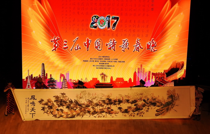 由屈原后裔屈金星与人人文学网总编王博生联合发起的中国诗歌春晚已成为最受全球华人瞩目的春节文娱活动之一。本届中国诗歌春晚以“诗颂中华•凤鸣天下”为主题,由云南会场总策划武眉凌女士和来自云南文山壮族苗族自治州的花鸟画家刘宏携着赠送给中国诗歌春晚的百尺巨幅画卷《凤鸣天下》开场,震惊全场,掌声经久不息!
