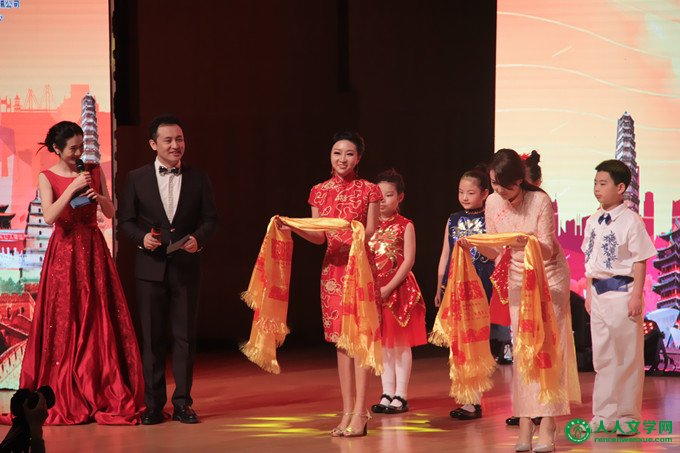 (刘雅阁与若离两位大使牵着本届诗歌春晚两位福娃亮相春晚舞台)