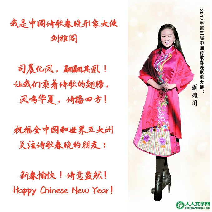 作为本届中国诗歌春晚形象大使,刘雅阁在第一时间向海内外各地的主、分会场发出她美好的祝福:“司晨化凤,翩翩其凰!让我们乘着诗歌的翅膀——凤鸣华夏,诗播四方! 祝福全中国和世界五大洲关注中国诗歌春晚的朋友:新春愉快!诗意盎然! Happy Chinese New Year!” ![]() ![]() (刘雅阁用哈达与首届诗歌春晚形象大使若离进行诗意的交接)