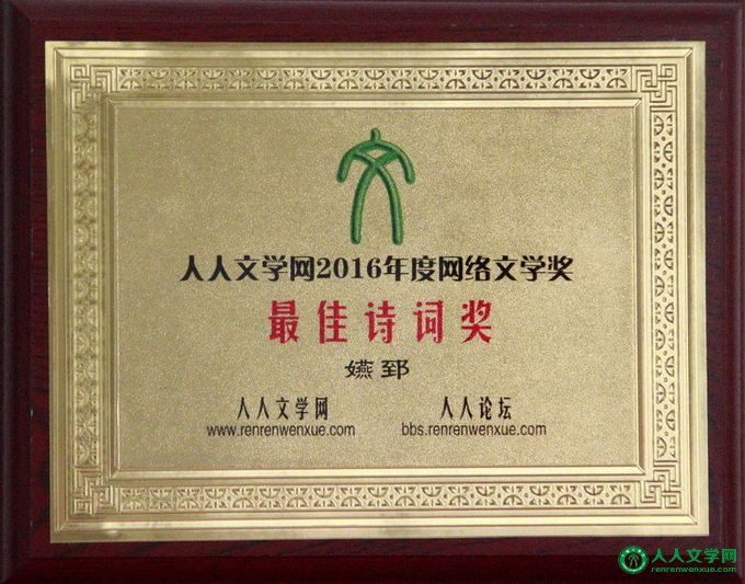 ![]() 最佳诗词奖——嬿郅 人人文学网2016年度网络文学奖:最佳诗词奖——嬿郅 【代表作】 诗词集:《嬿郅诗词》 【颁奖辞】 多愁善感,富于幻想,缠绵婉转,消沉忧郁。爱悠悠,恨悠悠,相思绕心头,思绪亦笔端。她的诗词格律工整,词牌严谨,平仄准确,用词巧妙。一首首清新委婉的古曲诗词,一篇篇精美绝妙的惊鸿短文,为女诗人嬿郅赢得了无数掌声。 嬿郅出生在四川遂宁,本名寇燕。遂宁人杰地灵,是陈子昂、王灼、张鹏翮、张船山、卓文君、薛涛、花蕊夫人、黄娥等历史名人和文豪才女辈出的人文摇篮。受此文风的传承与影响,让四州多了一位出类拔萃的女词人——嬿郅。她创作了近千首诗词及大量散文小说作品,许多诗词散文都是精美之作。给读者最深刻的印象就是作品语言唯美,让人感到作者锋芒逼人,才气横溢。她的诗词像她的名子一样,美到极致。 ![]() @ 嬿郅——获奖感言: 这次能被评为人人文学网2016年度网络文学奖——最佳诗词奖,我感到非常高兴和荣幸。首先,我对人人文学网给予我的厚爱与肯定表示深深的感谢,感谢评委会的赏识与支持!感谢人人文学网的文友们对我的认可! 诗词是一切美好的源头,身处喧嚣红尘中的我们更不该缺少诗情画意的浪漫与美好。我只是一个喜欢诗的普通女子,喜欢用文字来表达自己的喜怒哀乐。诗词是我前生今世的恋人,当我跟他初一相逢便有了白头之盟。还记得在很久很久以前,当我坐在小凳上,跟着哥哥姐姐们一起朗诵“青箬笠,绿蓑衣,斜风细雨不须归”时,我感觉自己已置身于瑶池仙境之中,一切的一切都是那么的美不可言…… 秋心酿清愁,星舟逐月,枕帆云渚。撷相思一缕,托风儿、寄吾精神侣。绾梦稚气髫年,青梅竹马,拥卿私语。至不惑之期,解忧伤、随我红尘来去。 今日成追感,铺陈翰墨,尽情倾诉。玫园疏影凝伫,听那寒蛩吟赋。韵律平仄邀觞,诗词佐酒,再遣参商舞。筝弦已醉,碧海银河妩。