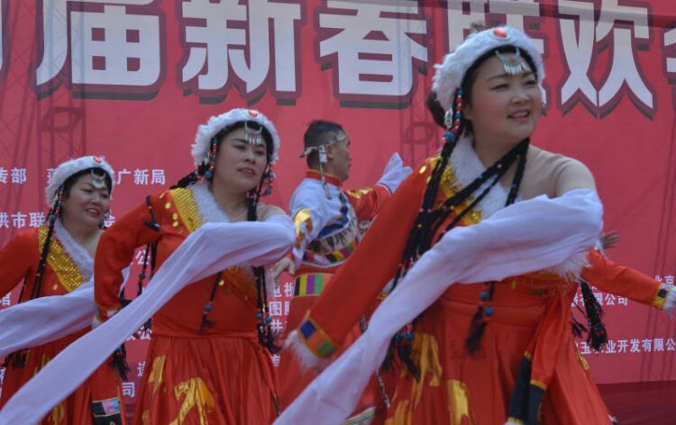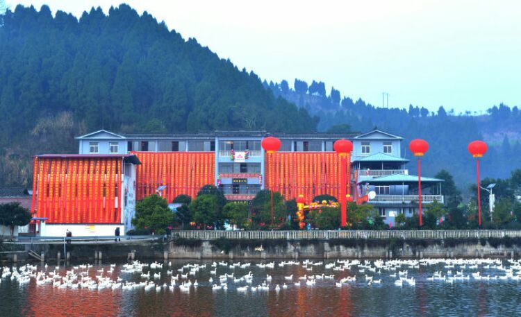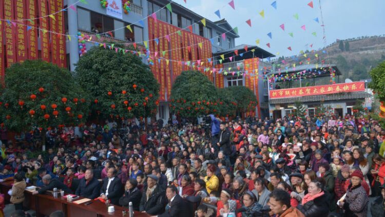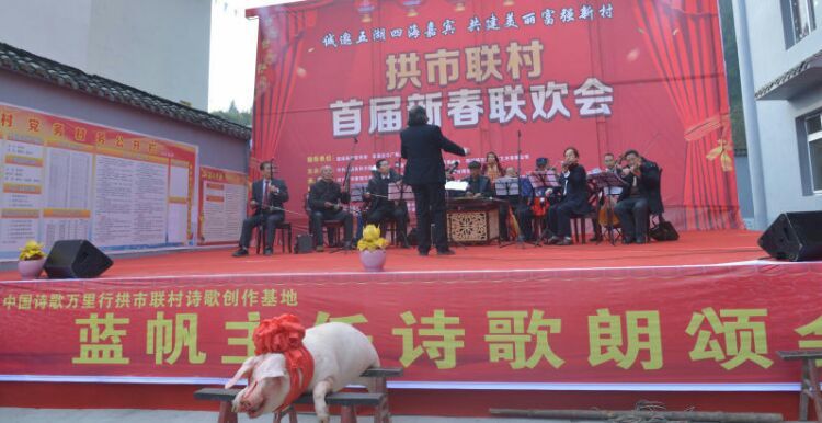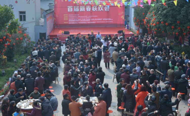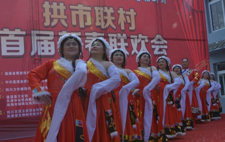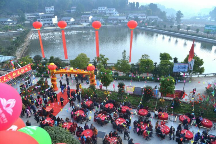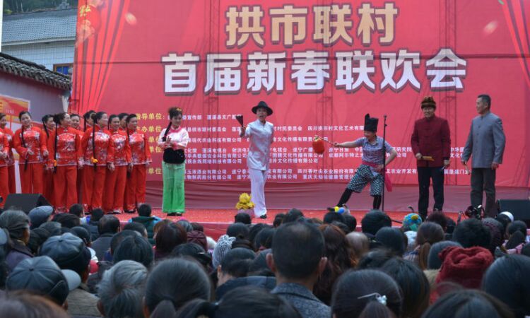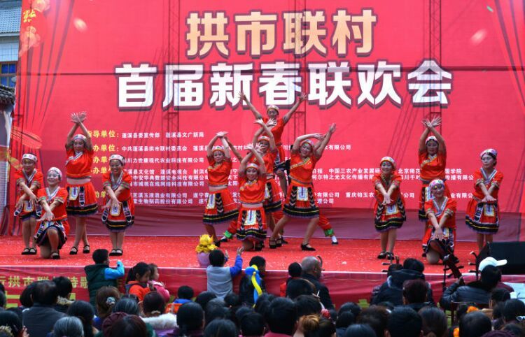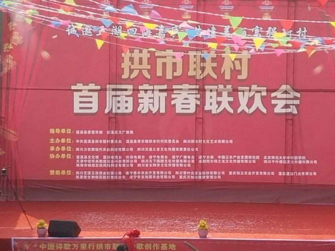 人人文学网讯:由中共蓬溪县拱市联村委员会、常乐镇拱市村村民委员会、四川拱市村文化艺术有限公司主办、四川力士康现代农业科技有限公司、四川天道之音文化传播有限责任公司协办的“中国拱市联村首届新春联欢会”,于1月22日在拱市联村文化大院,伴随着《喜洋洋》、《草原战歌》激越的器乐合奏拉开了帷幕。来至遂宁市、蓬溪县相关部门领导、民间艺术团队、北京、成都、重庆、绵阳等市特邀佳宾、常乐镇、拱市联村村民等近2000人参加了联欢会。联欢会以“脱贫致富庆丰收、不忘初心创辉煌”为主题,自编自演了丰富多彩的20多个文艺节目。节目重点歌颂了党和政府对农村改革的好政策、歌颂了拱市联村党委一班人,在书记蒋乙嘉的带领下开荒修路布产业、修渠扩堰兴水利,脱贫致富的先进事迹。赢得了村民们阵阵掌声。村民们载歌载舞欢聚一堂,吹拉弹唱尽情欢歌,活动搞得十分隆重。全村洋溢出幸福祥和的景象,大家喜气洋洋、别开生面地欢度新春佳节。联欢会上午举行了庆丰收茶话会。 下图,拱市联村文化大院披上节日盛装,彰显出红红火火过大年的乡村年味。六十多家企业和部门表示祝贺。