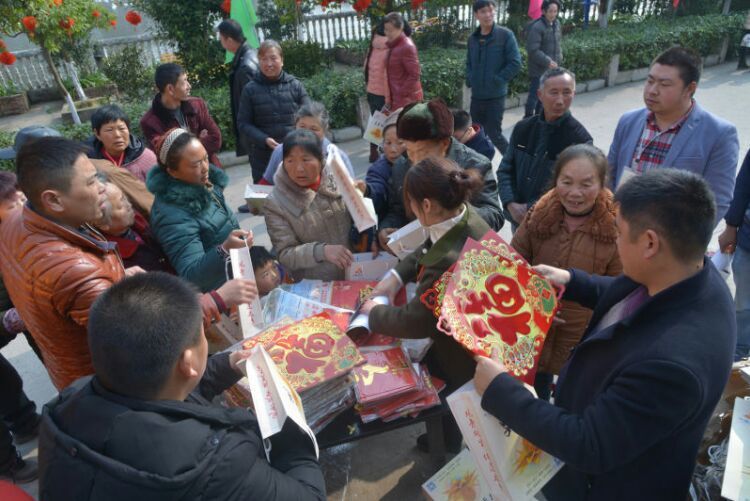 拱市联村党委向联村村民赠送福字和迎春对联。
