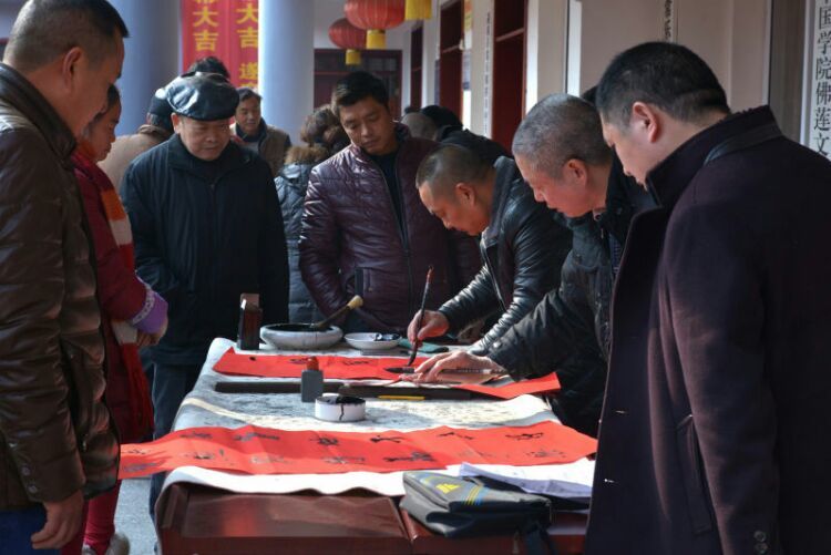 遂宁市书协组织书法家们到拱市联村义务书写迎春对联。