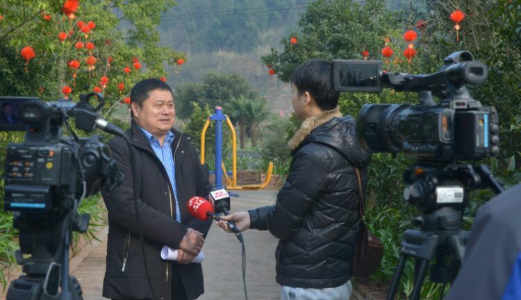 拱市联村党委书记蒋乙嘉接受遂宁市、蓬溪县电视台记者采访。