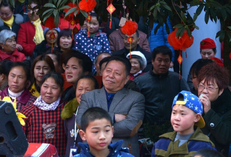 联欢会结束后,各路演出队纷纷要求与拱市联村村党委书记蒋乙嘉合影留念。
