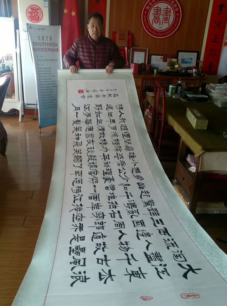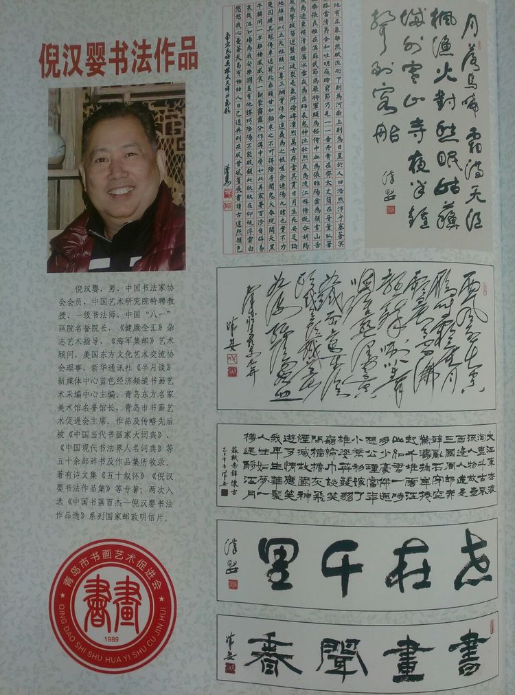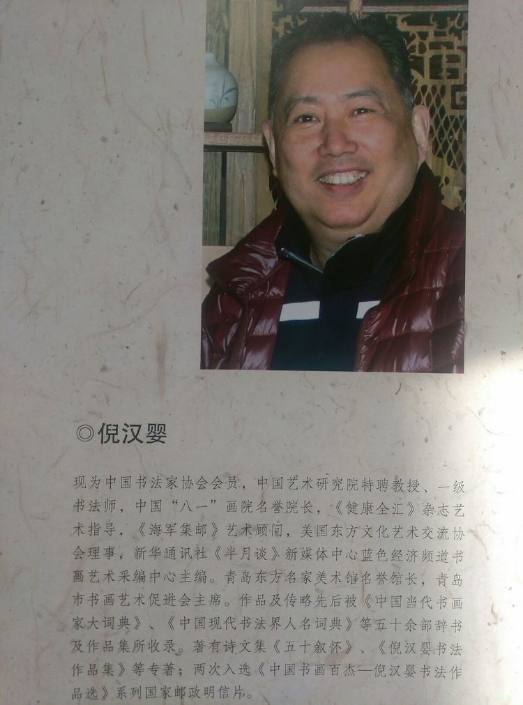 倪汉婴,1962年生,青岛市人,山东师范大学毕业。现为中国书法家协会会员,中国艺术研究院特聘教授,国家一级书法师,青岛市书画艺术促进会主席,中国八一画院名誉院长,北京艺术交流中心特邀艺术家,中国楹联学会会员,中国楹联学会书法委员会委员。6岁起即受其父童婴教诲(童婴乃中国当代著名书法家、诗人、作家,是被毛泽东主席称赞为“党内一枝笔,红军书法家”舒同的高足,故汉婴应属舒同之再传弟子),广临书帖,后又得中国书协主席张海、副主席朱丹、柳青等大家指点,功底深厚,书体典雅,其书法多为篆隶,擅长楷书,刚柔相济、古而不俗的笔风深得好评,作品多次在国内外获奖。作品曾多次参加省、市、全国书展。1989年获全国“琴岛杯”首届书画大赛一等奖;1990年获第51届“日本国际文化交流书道展金牌头赏”;1994年特邀作品入选“建国四十五周年全国名人书画大展”,同年获“中华当代艺术家作品大赛书法精品奖”,书法作品赴日本参加“中日书法交流大展”,其作品被中国书法家评审委员会评定为银奖,并授予“书法艺术家名人”称号;1995年获新加坡“猛龙杯全国美术创作比赛”最高荣誉匾;中国文联评审为书法“三级认定证书”。作品入选95跨世纪当代诗书画印作品大联展等。其书写的文天祥“正气歌”受到原国务院副总理、国防部长张爱萍上将的高度赞扬,并挥毫题赠“艺海无涯”;江泽民总书记到青岛视察时,曾受托为总书记书写了这首“正气歌”相赠;作品《红军不怕远征难》在毛泽东诞辰110周年之际被毛泽东后人永久珍藏;曾出版《倪汉婴书法作品集 》、《五十叙怀——倪汉婴诗文集》等。2013年12月,其12幅书法代表作收入“中国书画百杰系列邮政明信片”;刚进入马年,其篆书的《百马图》就在《青岛晚报》等媒体奔腾了。他的名字和作品及传略先后入选50多部辞书及作品集:《世界华人艺术家成就博览大典》《中国现代书画家名人大观》《当代中日书法作品汇观》《中国美术书法界名人名作博览》《中国当代楹联墨迹选》《中国国际文学艺术大观》《当代青年书法篆刻家精品集》《当代书画家福寿作品大观》《中国当代书法艺术大赛获奖作品集》《国际现代书法集》《中国当代艺术界名人录》等。 |