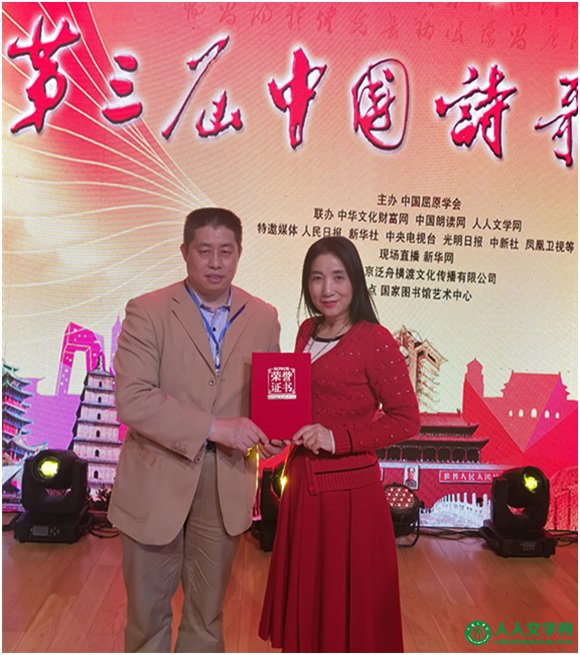 中国诗歌春晚书画总监于洪英女士为新加坡女诗人韩昕余颁发奖状 2017第三届中国诗歌春晚14日在北京中国国家图书馆正式开幕。在开幕前的13日晚上,首先举行了一场颁奖典礼,为在2016年取得优秀成绩的诗人、诗会、诗刊以及诗歌活动进行颁奖。 颁奖典礼吸引了国内外的诗人、诗会参与,不少诗歌爱好者现场见证了各奖项的颁布。据了解,此次晚会共设“十佳诗集”、“十佳诗会”、“诗意地标”、“诗意社区”“诗歌传播”等共十个奖项。 王芳闻、何孟梅、金辰、丁湘、阿紫、邹雅冰、邵建国、陈泰灸、赵迅、郗娟被晚会评选为“十佳诗歌活动家”。柳忠秧、张玉磬摘得“凤凰年(2017)年度诗人”。安娟英获“特别奉献奖”。