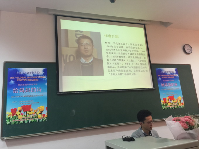 2017年母亲节百城联动诗歌朗诵会上海分会由2017年3月21日世界诗歌日新成立的上海社会科学院朗诵社和上海社会科学院研究生院分团委联合主办,于2017年5月14日下午2:00在上海社科国际创新基地举行。著名诗人伊沙身为上海母亲的儿子,每一年都会支持母亲节朗诵会上海分会的活动,为纪念逝去的母亲,今年他朗诵2010年的作品《山中母亲节》(视频);