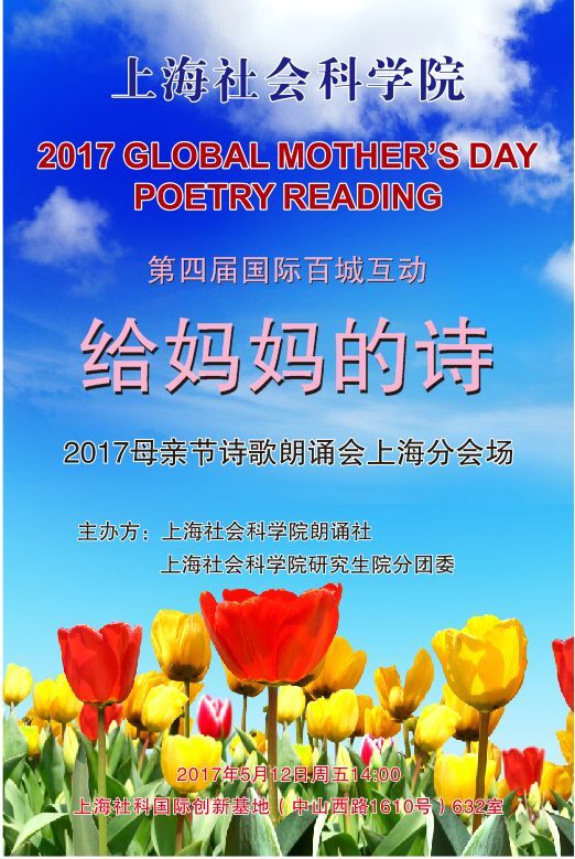 全球百城联动母亲节诗歌朗诵会,这是一个自发性的、公益性、松散型诗人互动活动,四年来一直坚持公益原则。也只有在这样的移动互联网时代,才会有这样大规模的交流与互动。据了解,第一届国内外50多个城市的诗人参与,第二届120多个城市,第三届有200多个城市参与,2017年的第四届,在去年的老班底的基础上,目前报名的城市260多个。今年上海母亲节朗诵会的分会场特意安排在上海社科院研究生院进行,由新成立的社科院朗诵社和研究生院分团委联合主办,朗诵社老师、参与的研究生们一起创作和分享了献给母亲的诗篇,并通过互联网与当代诗人、朗诵家切磋交流。本次活动也通过微信微博加入到百城联动母亲节诗会的大活动中。