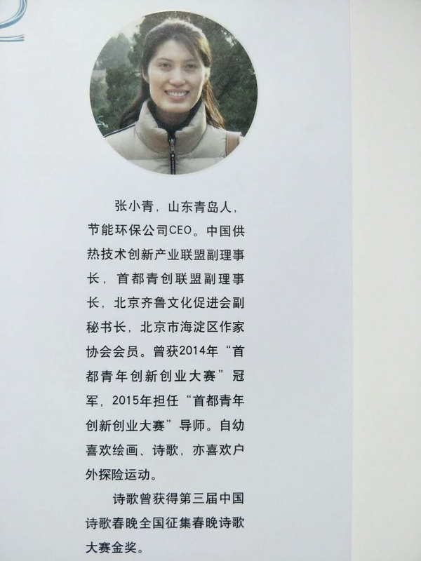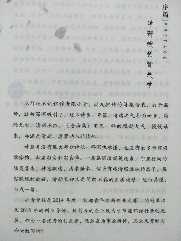 小青曾经是2014年度“首都青年创新创业大赛”的冠军以及2015年的创业导师,她创办的企业致力于节能环保行业的发展。作为一名优秀的创业者,既然在为事业拼搏,怎么又有时间和兴致写诗? 鱼与熊掌不可兼得,事业与爱好却可以兼收。虽然没有专业从事文学工作,但因为爱好写诗,小青被人冠以“才女,奇女子”等溢美之词。面对赞誉,她低调的表示,自己只是简简单单做事情、真性情流露,只是用清丽感性的触感,单薄不丰赡的笔力,偶尔捡拾沧海一粟而已。做企业是很辛苦累心,在商海里沉浮,并没有太多时间游弋在文学诗歌,只是把写诗当做闲暇时的一片暖阳飞雪,或是几庐雾里庭花的氤氲景致。一开始,只是有些诗意的情怀,柔软的情愫,在偶尔间抒发书写,但累积久了,却写出了些许的简约诗篇。可能做企业和写诗歌不太搭,但是诗歌的力量源于情怀意境,而且企业家也是需要情怀的,“达则兼济天下”就是一种社会责任的人文情怀,所以诗歌可以与企业并举。有朋友曾对她说,“如果你诗写的好,企业也做的很好,那么,你就是一个传奇”。小青却说,她从来没有想过要去做个传奇,对于诗歌,喜欢就好,对于企业,努力就好。 我想,作者来自美丽的岛城——青岛,自是喜欢蓝天碧海、清风轻扬的意境的,在商海里,也确是清丽不群的气质,秀外慧中的翘楚。所以,虽是沧海一粟,却也是大海里一闪亮的贝壳,商海里不同浮繁的别样风景。 一位温暖逸致,率性不羁的美好女子,也难得一本率真简约情深的诗集。 是为序。 ——洪烛