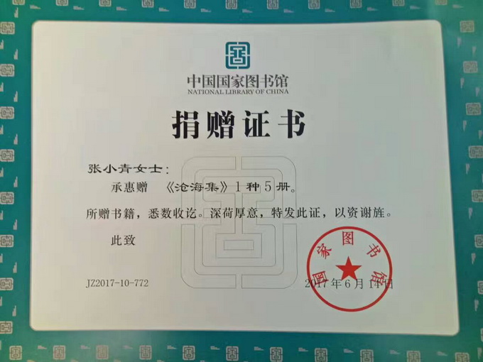 近日,中国国家图书馆收藏了青岛女诗人张小青新诗集《沧海集》。诗集由著名诗人洪烛先生为其作序,中国广播电视大学出版社出版。