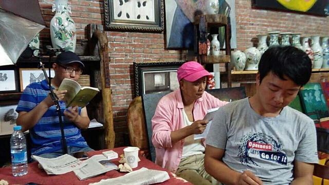 文/花语 人人文学网讯: 6月28日,旅新诗人舒然诗歌朗诵会(宋庄站)于北京通州宋庄的梨花公社启动,参加诗会的有诗人赵丽华、蓝京华、花语、潘漠子、舒然、查曙明、水云烟、红色药水、秦进斌、阿琪阿钰、李川、魏海波、李长江、阿隐,姜博瀚、沉沙、攀峰、野雪、莫腊、冷宇飞红、述早、苏娇骄、刘一宁、沈亦然、阿炳等数十人,诗会由诗人花语担任策划和活动主持。 较之于6月24日,北京朝阳公园草原文化部落学术气息浓郁的舒然诗歌研讨暨朗诵,宋庄站的诗会更轻松、幽默、颇具摇滚风格。诗会前,诗人们在海报上签名、合影,留连于梨花公社的花草、诗画,兴致高涨! 诗人花语在致辞中说,把宋庄作为舒然诗会的第二站,是站在国际视野,对这个举世闻名的全世界最大的艺术集散地的欣赏和肯定。著名策展人、诗人蓝京华在发言中指出:“当诗歌的书写不再强调其意义之时,才是达到鼎盛”;诗人赵丽华是近年来由诗人身份变身画家成功转型的典范,作为梨花公社的社长,赵丽华收徒写诗画画,自有其功德和非凡的意义。 之后,由著名女诗人水云烟打头的朗诵会开启了一个浪漫的下午,诗人们纷纷上台朗诵了旅新诗人舒然的诗作,中间穿插有摇滚创作歌手、诗人李长江、诗人阿隐的吉它弹唱,海子胞弟查曙明深情背诵了海子的《四姐妹》和《面朝大海,春暖花开》,引来热烈掌声,在后来的朗诵中,用家乡话朗诵的诗歌,逼出了大家的笑声和眼泪,我们祖国的母语,原来是那么丰富,元素多样又耐人寻味。 诗会主角舒然,作为旅居新加坡的华语诗人、策展人,近年来活跃在新加坡和印尼,有多组诗作见诸新加坡《联合早报》文艺城、《新华文学》、《五月诗刊》、印尼国际日报《东盟文艺》等,她现为新加坡锡山文艺中心理事、新加坡文艺协会会员、新加坡美术总会会员、新声诗社艺术顾问、新加坡坤德院院长。曾受邀出席2015年第十四届亚洲华文作家代表大会和2016年世界华文作家协会第十届代表大会。荣膺2014-15年度“新加坡世界夫人慈善皇后”, 获颁2016“亚洲最强品牌名人大奖”。 具有诗经风格,穿越于古典与时尚的诗人舒然,气质典雅,形象端庄,像她的诗一样,她穿梭于南洋与乡愁之间,我们有理由相信,随着时间的敲打,她能写出更多更美的诗章! 此次活动由北京三硕文化发展有限公司主办,梨花公社、花语诗社、海子诗社、阿琪阿钰诗歌书店、凤凰生活网、人人文学网、诗词网、国粹网等协办!(编辑 仁边)