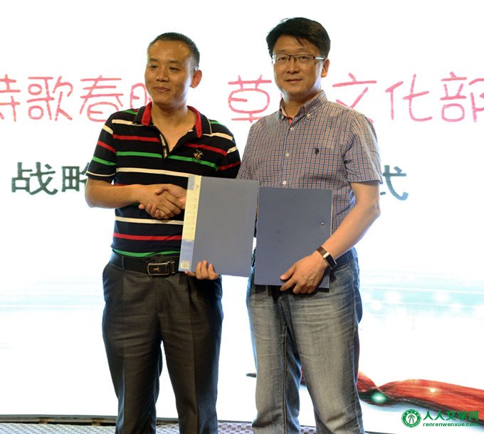 本报讯 7月12日,2018中国诗歌春晚西部首家青海会场授牌仪式在北京草原文化部落举办,中国诗歌春晚发起人、总策划屈金星现场为2018第四届中国诗歌春晚青海分会场总策划李静授牌,同时,中国诗歌春晚组委会还与草原文化部落、《文学高地》编辑部签署战略合作协议。作家网总编辑、草原文化部落董事长冰峰,《文学高地》主编、青海分会场总监制任立分别代表各自单位与中国诗歌春晚发起人、总策划屈金星上台签字。