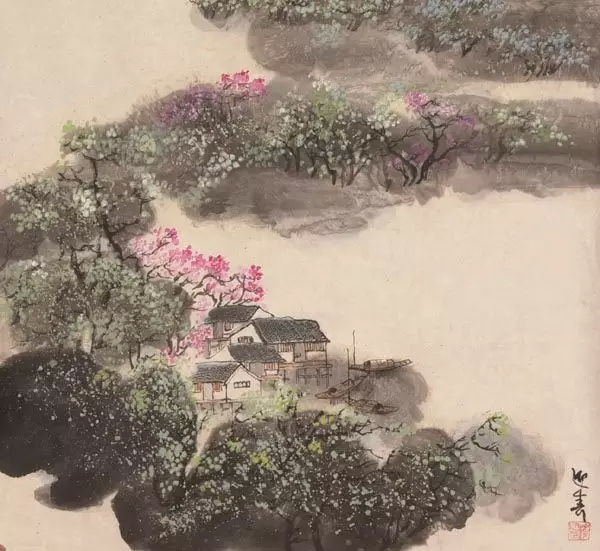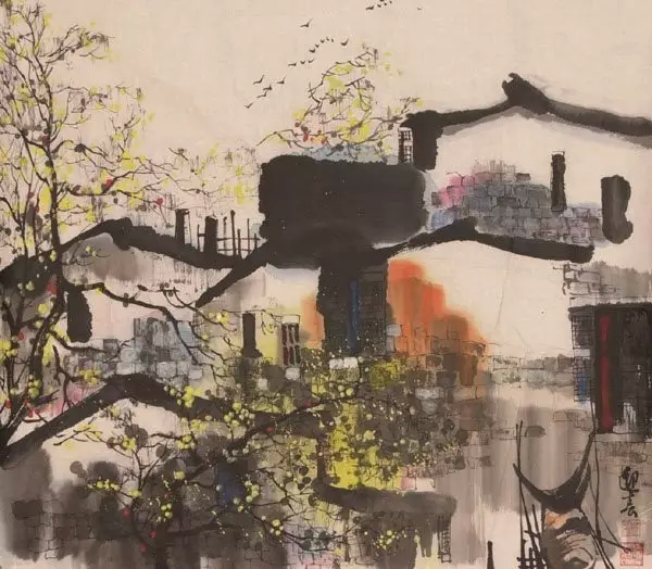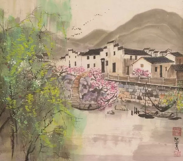 碧云江上, 鸟飞山前, 晚时炊烟。