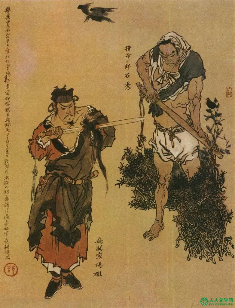 时迁在《水浒》里要算个人物,但石碣天书却把他排在地煞星的倒数第二,连白日鼠白胜都在他的前面,后面是毫无作为的“金毛犬段景住”,这实在是委屈了他。 如“拼命三郎石秀”。“拼命”和“三郎”放在一起,便产生一种特殊的意境,产生一种美感。大郎、二郎都不成,就得是三郎。这有什么道理可说呢?大哥笨、二哥憨,只有老三往往是聪明伶俐的。中国语言往往反映出只可意会的、潜在复杂的社会心理。 拼命三郎不止是不怕死,敢拼命,路见不平,拔刀相助,为朋友两肋插刀,更重要的是说他办事爽快,凡事不干则己,干,就干净利落,绝不拖泥带水。这是个工于心计的人,绝不是莽莽撞撞。看他杀胡道,杀海阇黎、杀潘巧云、杀迎儿,莫不经过翔实的调查,周密的安排,刀刀见血,下手无情。这个人给人的印象是未免太狠了一点。石秀上山后无大作为,只是三打祝家庄探路有功,但《水浒》写得也较平淡,倒是昆曲《探庄》给他一个“单出头”的机会。曾见过侯永奎的《探庄》,黑罗帽,黑箭衣,英气勃勃。侯永奎的嗓子奇高而亮,只是有点左,不大挂味,但演石秀,却很对工。