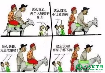 一对夫妻和一头驴子的故事。 刚开始是妻骑着驴子,夫牵着驴, 路人指指点点:像什么样子?这女人太不像话,居然让男人牵驴。 妻听了,脸红了,和夫换个位置。 这下夫骑驴,妻牵驴,没走几步, 路人又开始指指点点:像什么样子?这男人太不像话,居然让女人牵