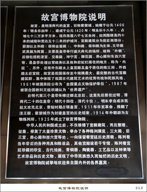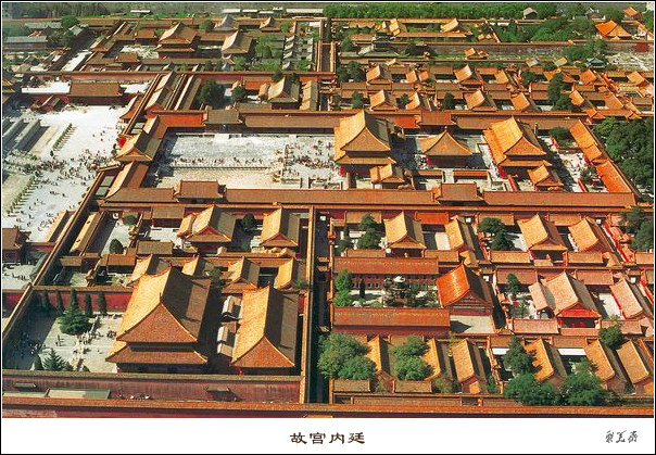 故宫位于北京市中心,也称“紫禁城”。这里曾居住过24个皇帝,是明清两代(公元1368~1911年)的皇宫,现辟为“故宫博物院”。故宫的整个建筑金碧辉煌,庄严绚丽,被誉为世界五大宫之一(北京故宫、法国凡尔赛宫、英国白金汉宫、美国白宫、俄罗斯克里姆林宫),并被联合国科教文组织列为“世界文化遗产”。故宫的宫殿建筑是中国现存最大、最完整的古建筑群,总面积达72万多平方米,有殿宇宫室9999间半,被称为“殿宇之海”,气魄宏伟,极为壮观。无论是平面布局,立体效果,还是形式上的雄伟堂皇,都堪称无与伦比的杰作。一条中轴贯通着整个故宫,这条中轴又在北京城的中轴线上。三大殿、后三宫、御花园都位于这条中轴线上。在中轴宫殿两旁,还对称分布着许多殿宇,也都宏伟华丽。这些宫殿可分为外朝和内廷两大部分。外朝以太和、中和、保和三大殿为中心,文华、武英殿为两翼。内廷以乾清宫、交泰殿、坤宁宫为中心,东西六宫为两翼,布局严谨有序。故宫的四个城角都有精巧玲珑的角楼,建造精巧美观。宫城周围环绕着高10米,长3400米的宫墙,墙外有52米宽的护城河。现在,故宫的一些宫殿中设立了综合性的历史艺术馆、绘画馆、分类的陶瓷馆、青铜器馆、明清工艺美术馆、铭刻馆、玩具馆、文房四宝馆、玩物馆、珍宝馆、钟表馆和清代宫廷典章文物展览等,收藏有大量古代艺术珍品,据统计共达1052653件,占中国文物总数的六分之一,是中国收藏文物最丰富的博物馆,也是世界著名的古代文化艺术博物馆,其中很多文物是绝无仅有的无价国宝。